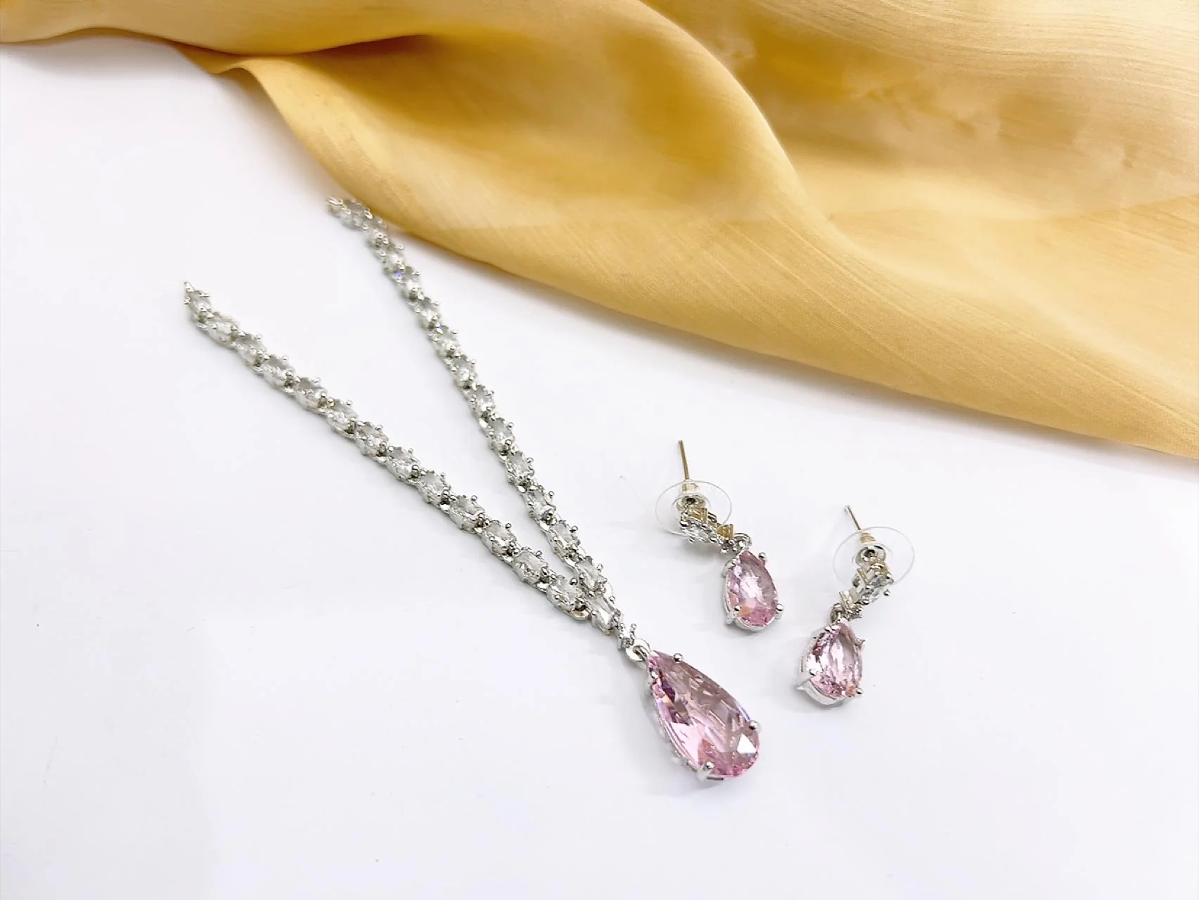 This exquisite 1 carat pink teardrop artificial jewellery set is designed to bring a touch of luxury to your formal wardrobe. The centerpiece features a master-crafted, pear-cut pink simulated crystal that perfectly replicates the brilliance of a 1-carat diamond. Set against a high-shine silver-plated finish, the necklace and matching drop earrings are encrusted with premium zircon stones to ensure you glow at every wedding or special event.