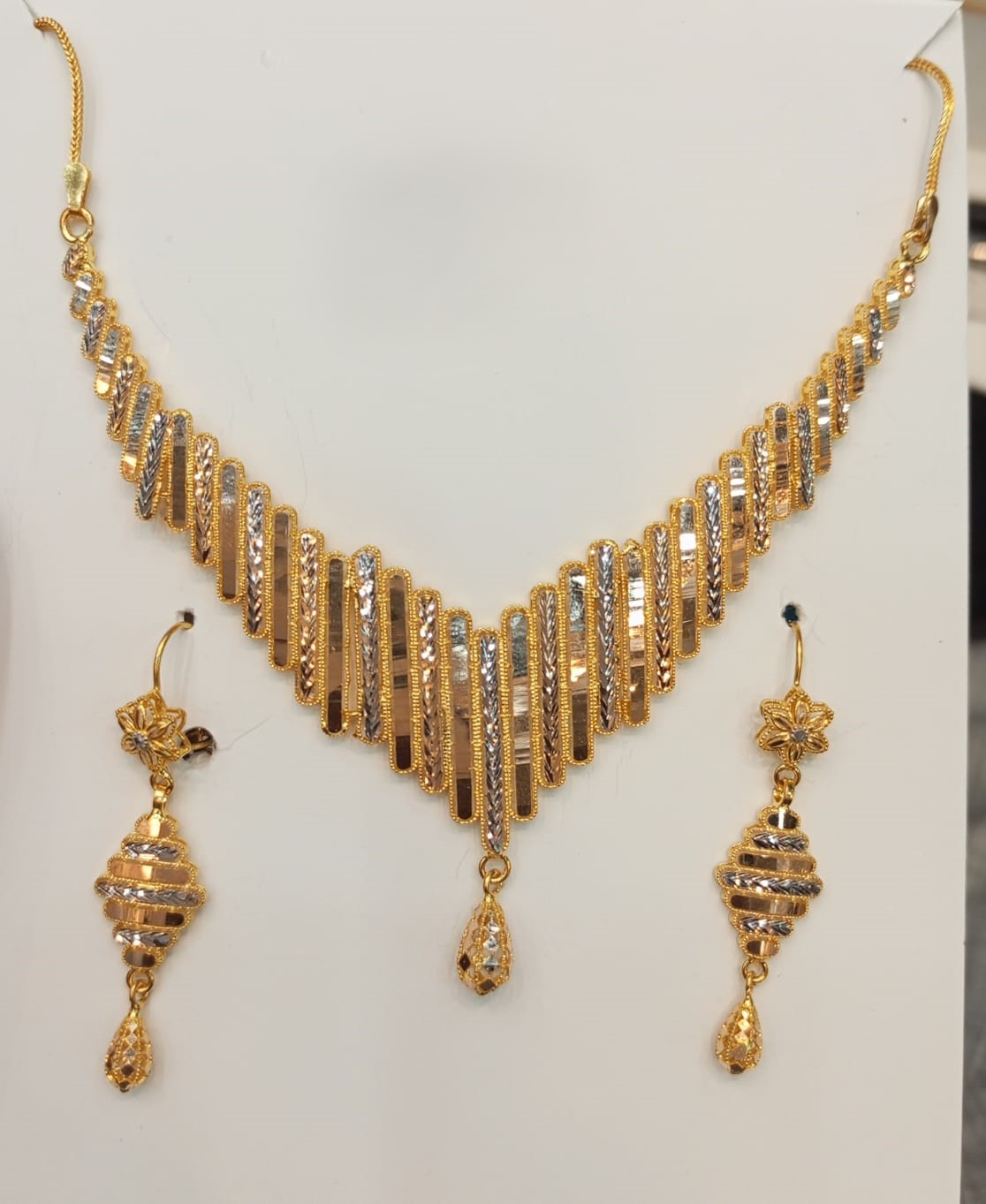 The Ultimate Expression of Modern 916 Gold Artistry. Elevate your wedding day silhouette with this 22K Gold Bridal Necklace Set, a signature piece that blends heritage purity with 2026’s most sought-after architectural trends. Crafted from authentic 916 hallmarked gold, the necklace features a rhythmic, graduated chevron design of vertical bars. Each bar is meticulously engineered to alternate between a shimmering frosted texture and a high-mirror polish, creating a mesmerizing play of light that captures the eye from every angle.
