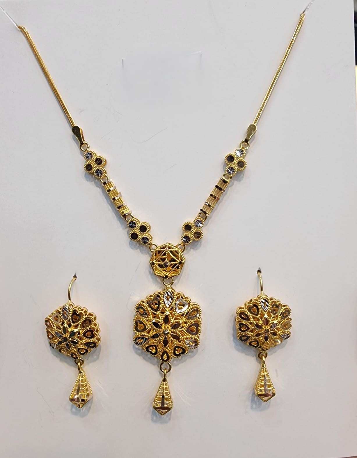 Elevate your bridal collection with this 11.080g 22K gold necklace set. Featuring a radiant sun-motif medallion and teardrop accents, this set is a perfect example of premium handcrafted jewelry design.