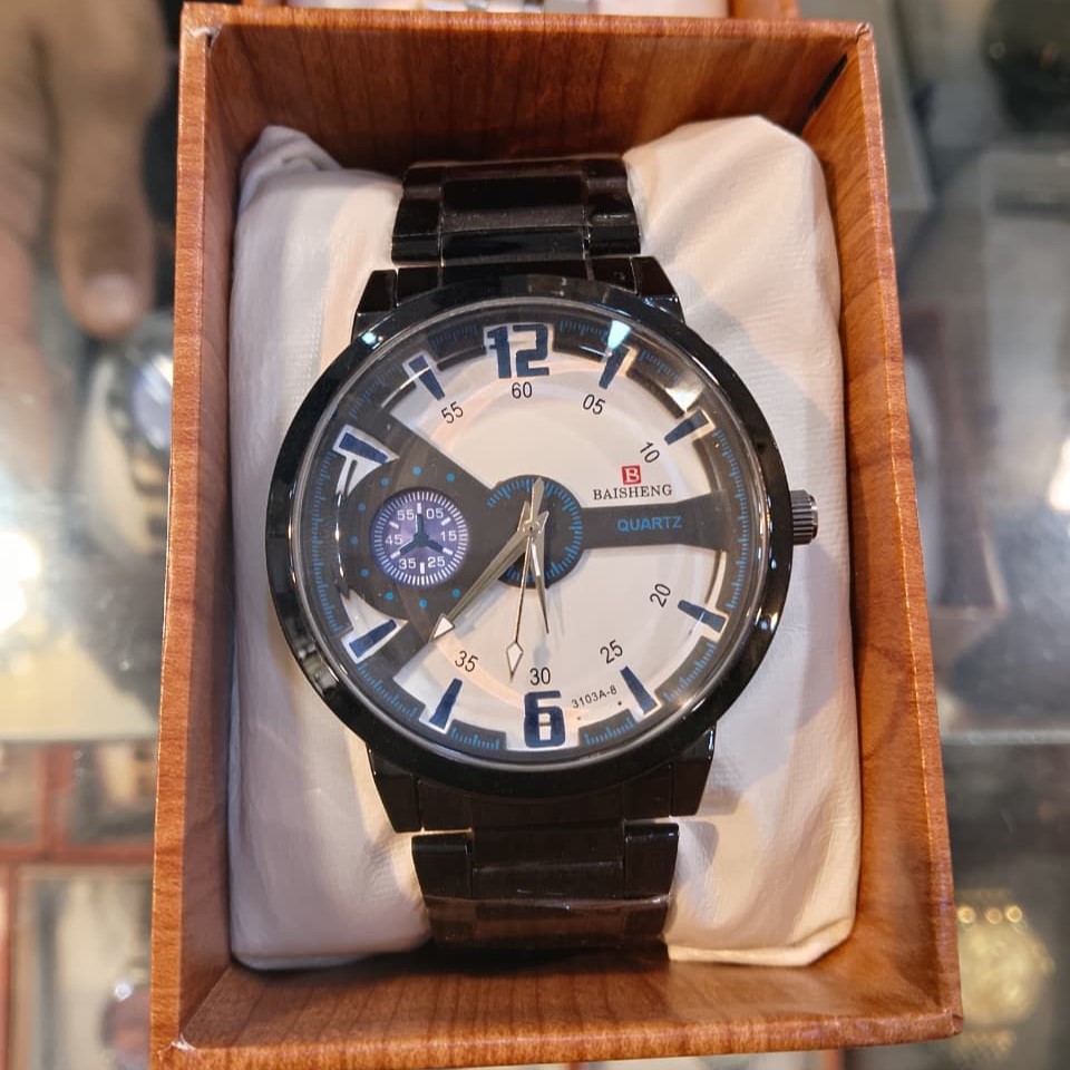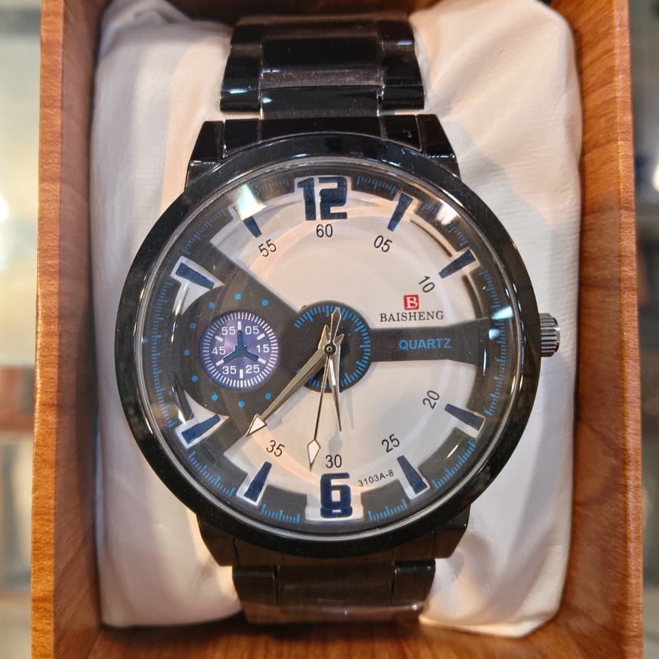 Built for resilience, the watch is housed in a hardened case with a brushed metal finish. The stainless steel chain is treated with a black permanent coating to resist fading and perspiration-based tarnishing. Powered by a high-accuracy quartz movement, it maintains precision within $\pm15$ seconds per month. With its splash-resistant mineral glass protection and secure push-button lock, this Baisheng watch is a reliable, technical accessory for any modern wardrobe.