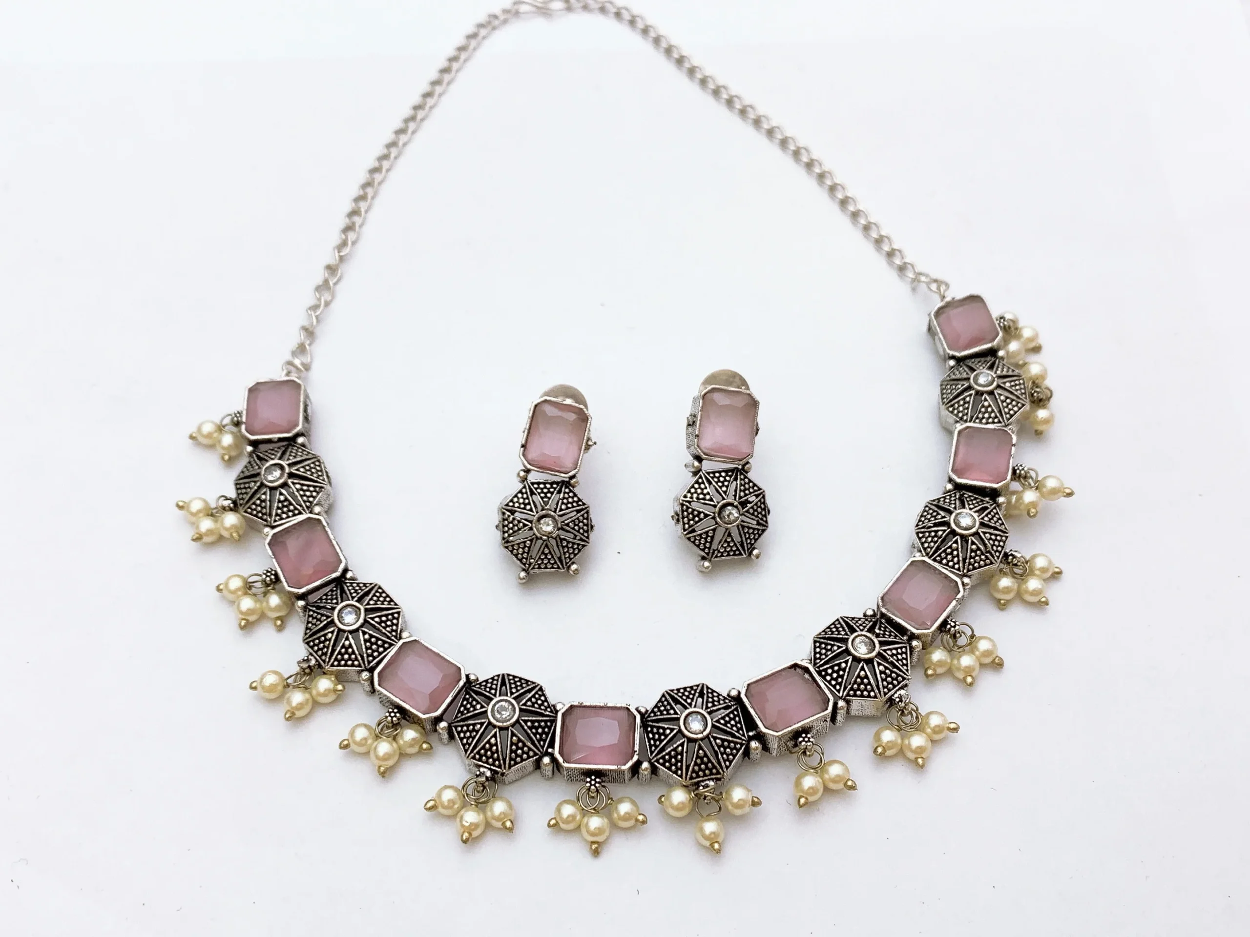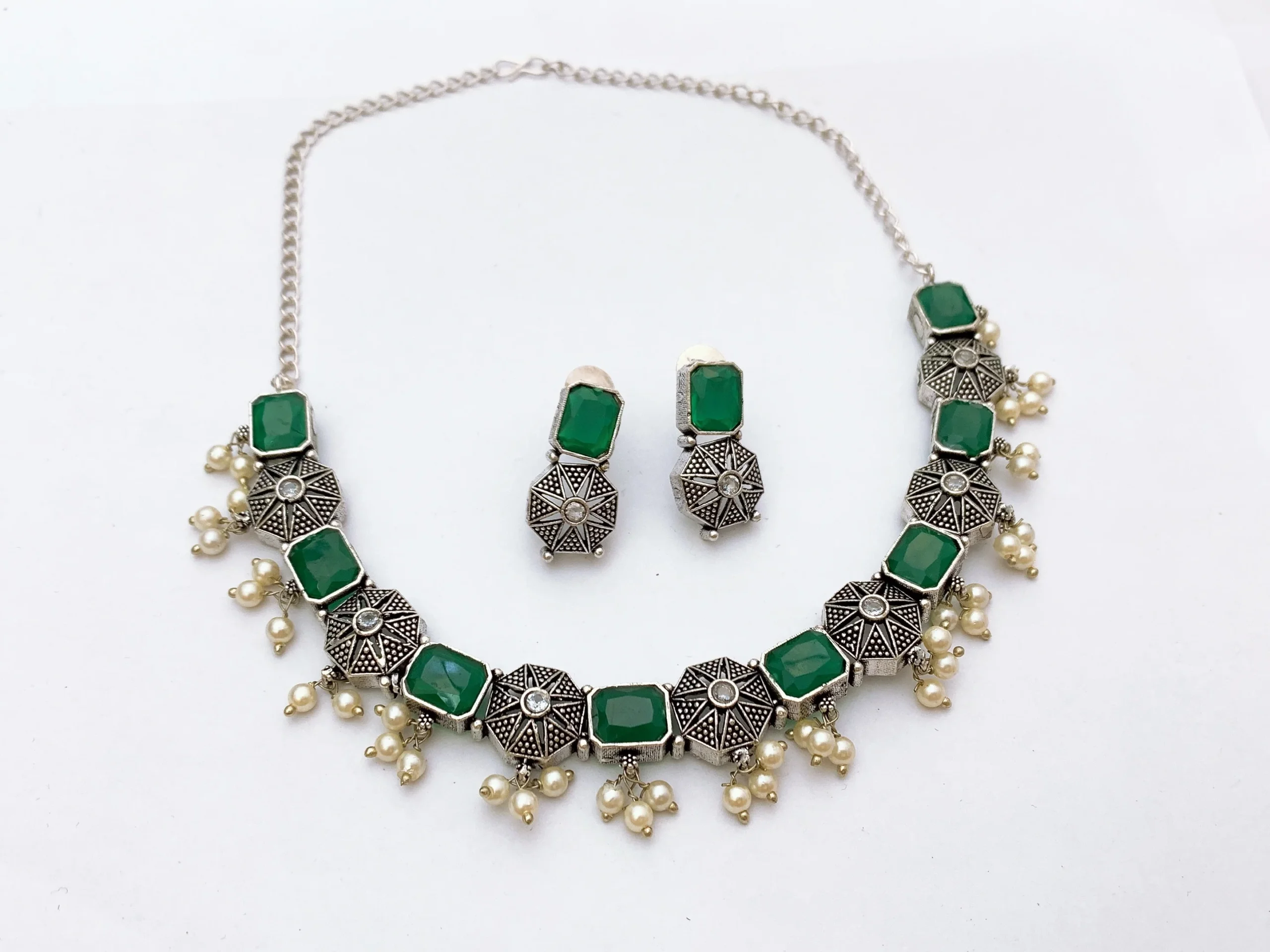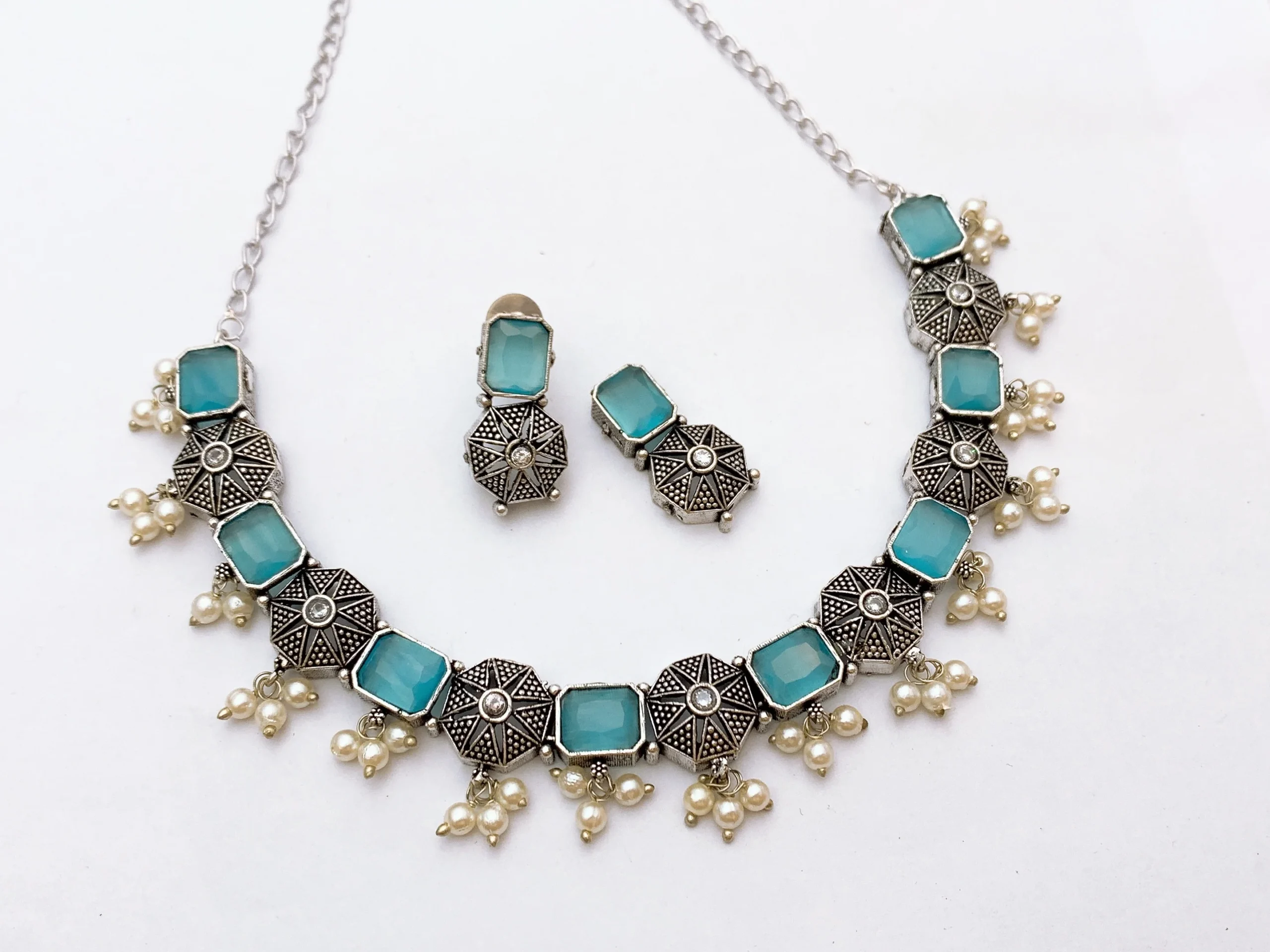 Crafted for durability and style, the necklace includes a secure lobster clasp with an adjustable chain for a customized fit, paired with matching geometric stud earrings. Choose from three vivid faceted stone colors—Sky Blue, Forest Green, or Blossom Pink—to personalize your gothic look. This jewelry set is the ultimate statement piece for anyone seeking to merge heritage artisan details with a modern, rebellious flair.