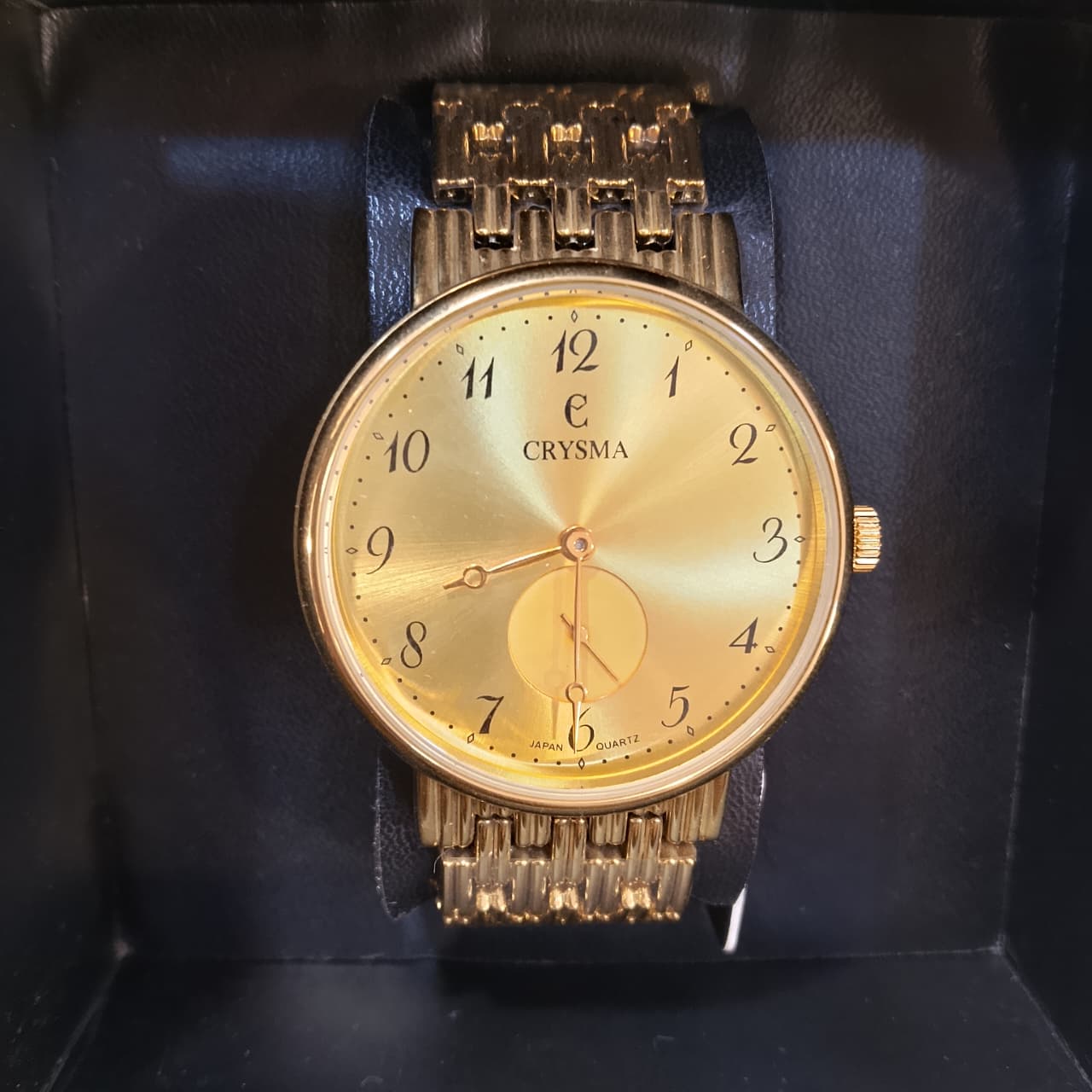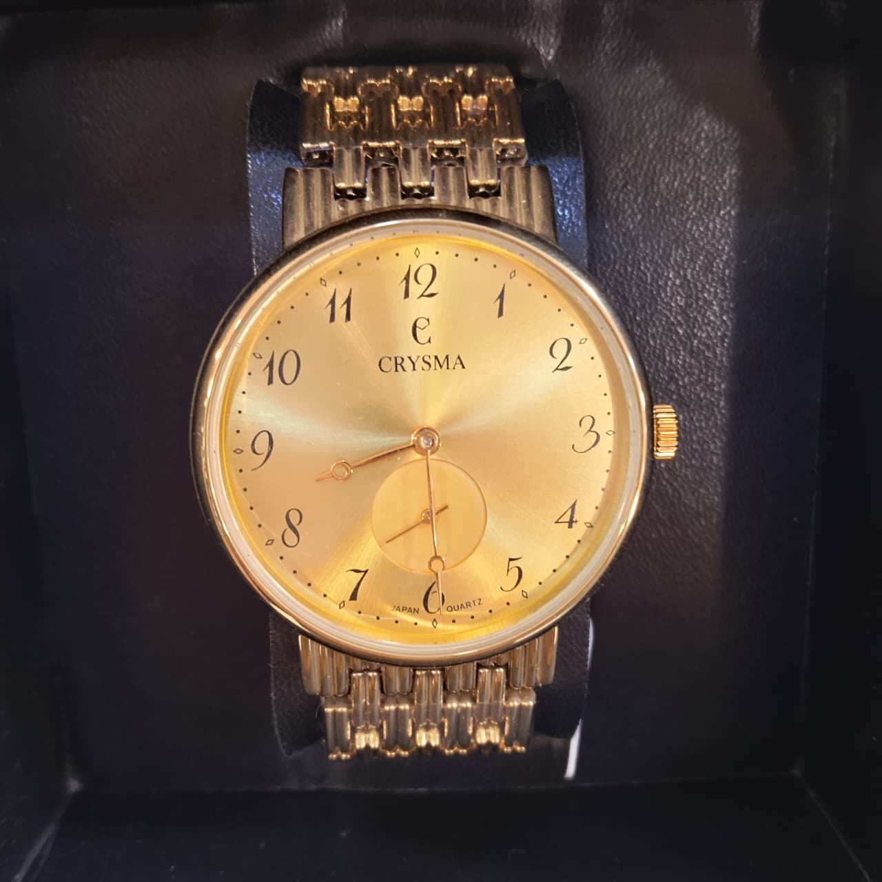 The Crysma Kairos CRL9050 represents the intersection of precision engineering and luxury design. The 44mm case is meticulously crafted from brass and finished with a high-quality gold electroplating that provides a deep, mirror-like luster. Protected by scratch-resistant Hardlex glass, the radiant gold sunray dial is accented by classic Arabic numerals and a dedicated sub-second dial at the 6 o’clock position.