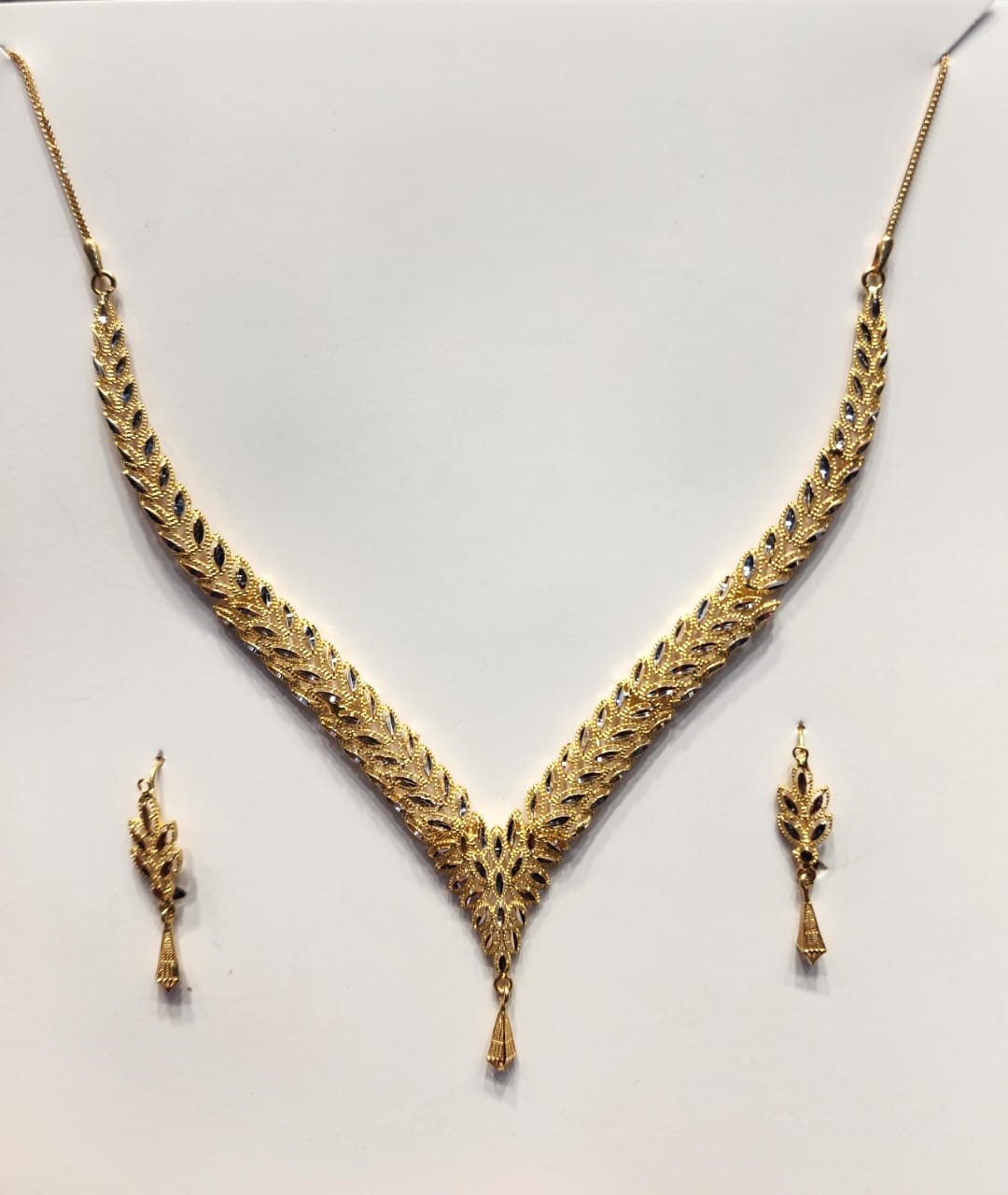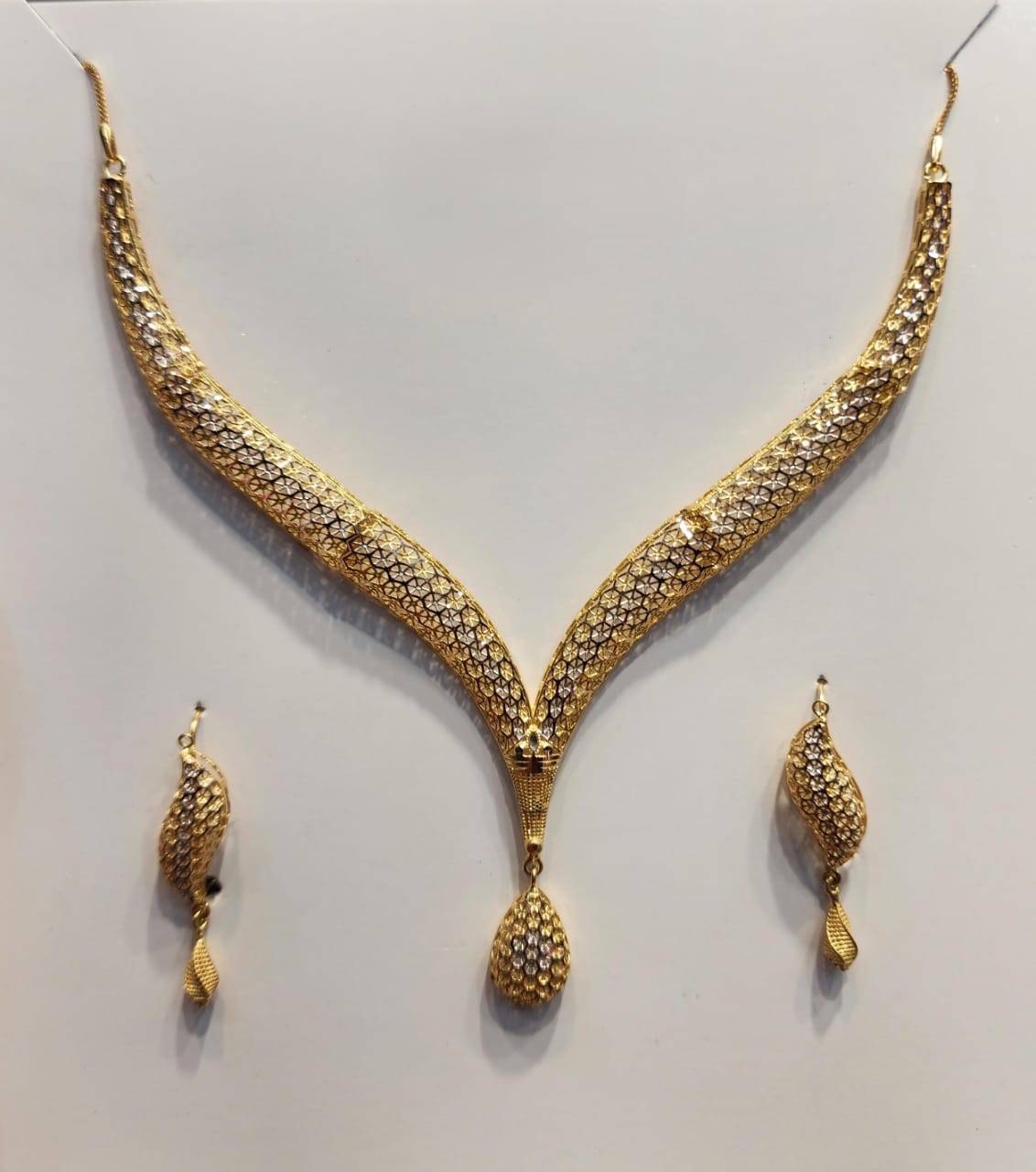 Make a lasting impression with this authentic 21K gold V-shaped necklace set, designed for women who appreciate real luxury and certified quality. This piece is crafted from genuine gold and carries an official hallmark stamp, ensuring purity and trust you can rely on. The intricate textured detailing creates a brilliant shine under any light, while the elegant V-shape naturally enhances your neckline for a refined, high-end look. Finished with a beautifully designed drop pendant, this necklace delivers a perfect balance of bold presence and timeless sophistication.