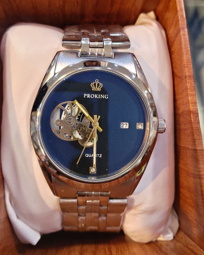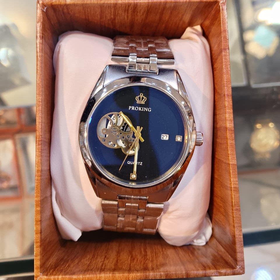 The deep midnight blue dial is accented by gold-tone hands and minimalist markers, creating a sophisticated color palette. A discrete date window is positioned at the 3 o’clock mark for added daily utility. The watch is completed with a classic five-link stainless steel bracelet that offers both a comfortable fit and a refined silhouette. Whether you are dressing for a business meeting or a casual evening out, the PROKING Elite makes a bold statement of style and curiosity.