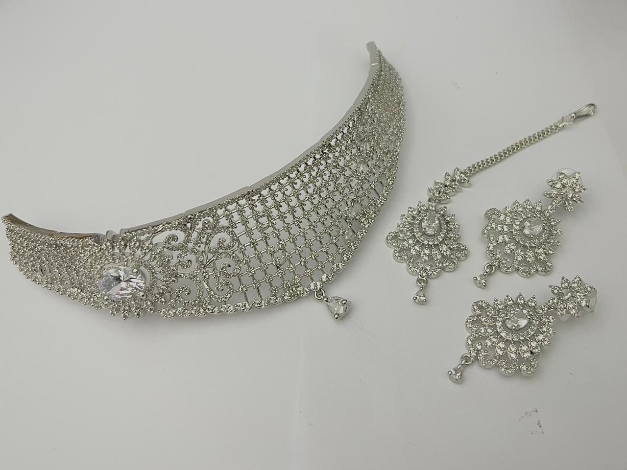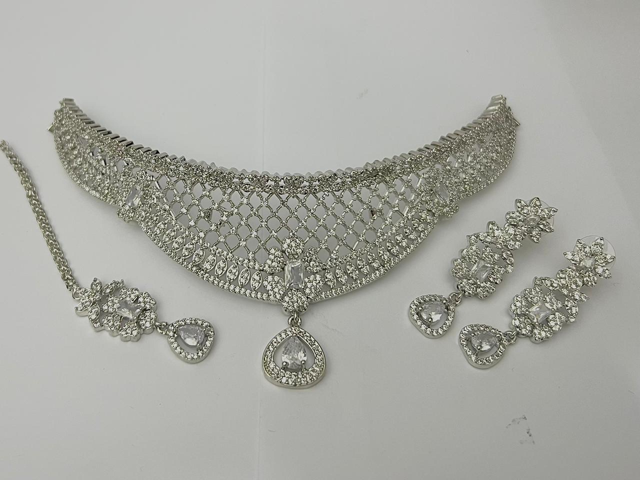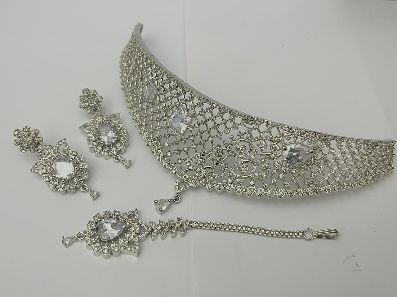 This complete 1 carat bridal necklace set in Pakistan includes a beautifully designed choker, matching chandelier earrings, and a coordinating maang tikka. Available in multiple bridal variations, it is lightweight, adjustable, and crafted with durable silver plating — making it ideal for weddings, engagements, receptions, and formal events across Pakistan.