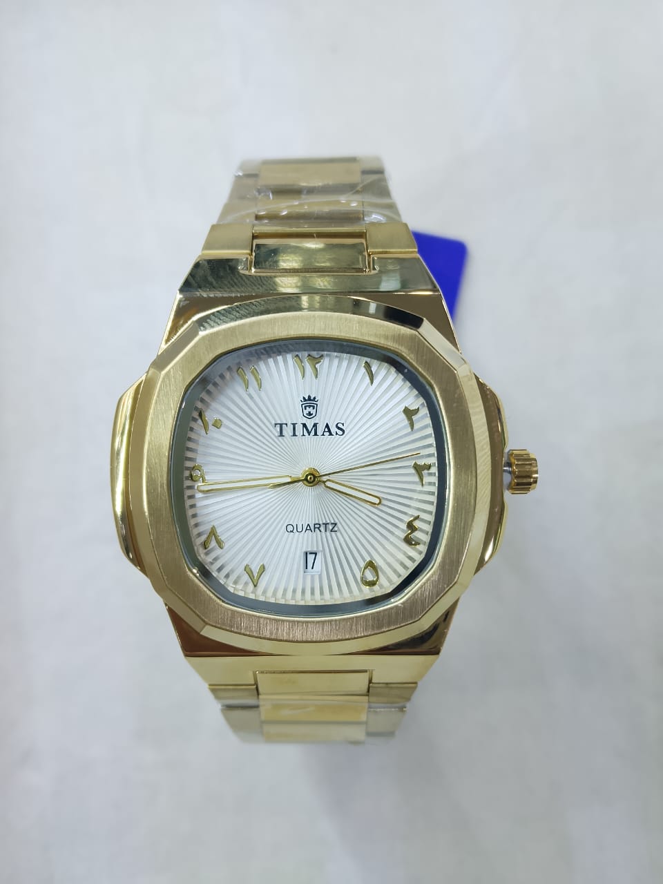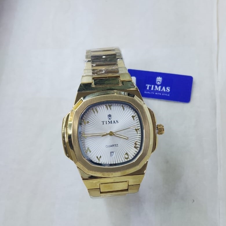 The TIMAS Prestige is a bold fusion of cultural heritage and modern luxury design. This timepiece features a radiant gold-finished stainless steel case with a sophisticated octagonal bezel that commands attention. The dial is intricately textured with a vertical sunray pattern, providing a stunning backdrop for the gold-tone Arabic numerals that serve as hour markers.