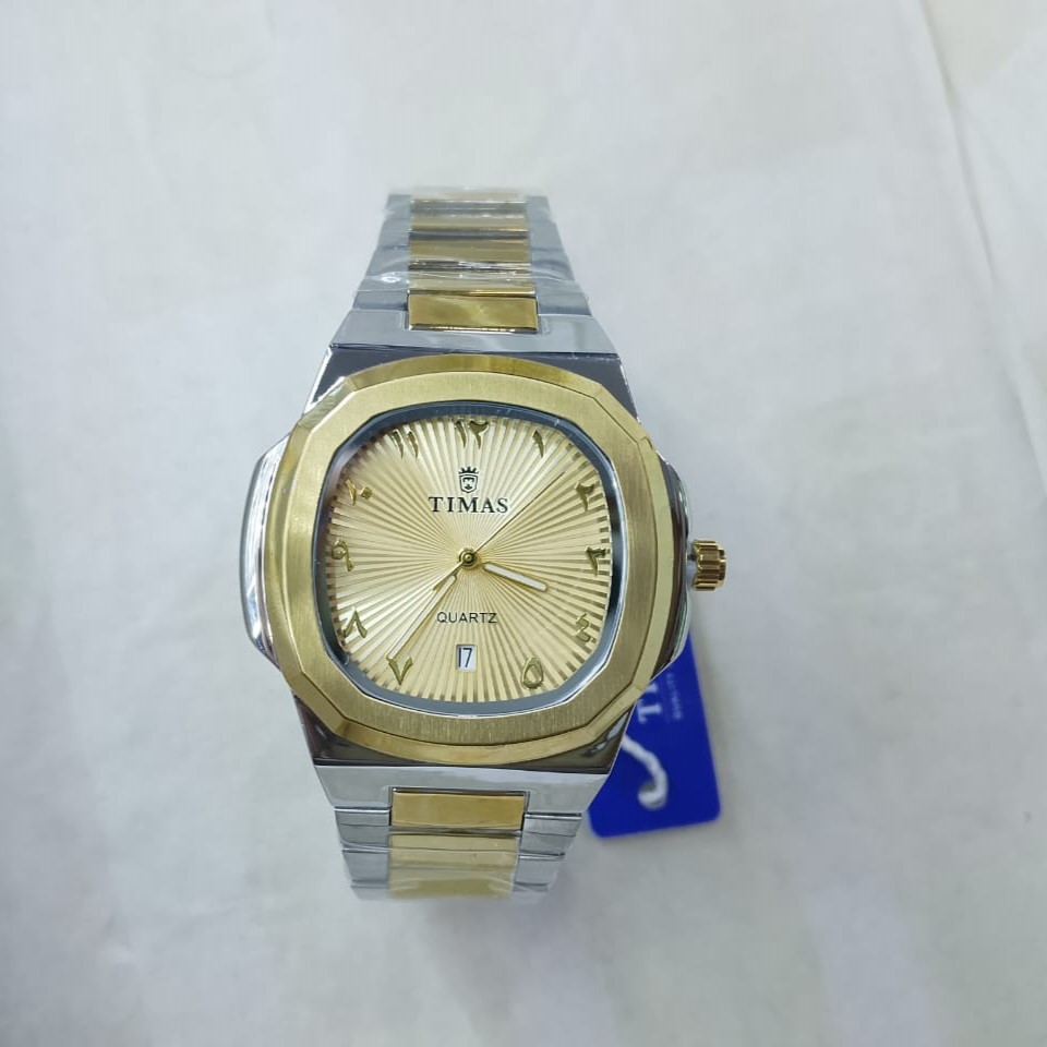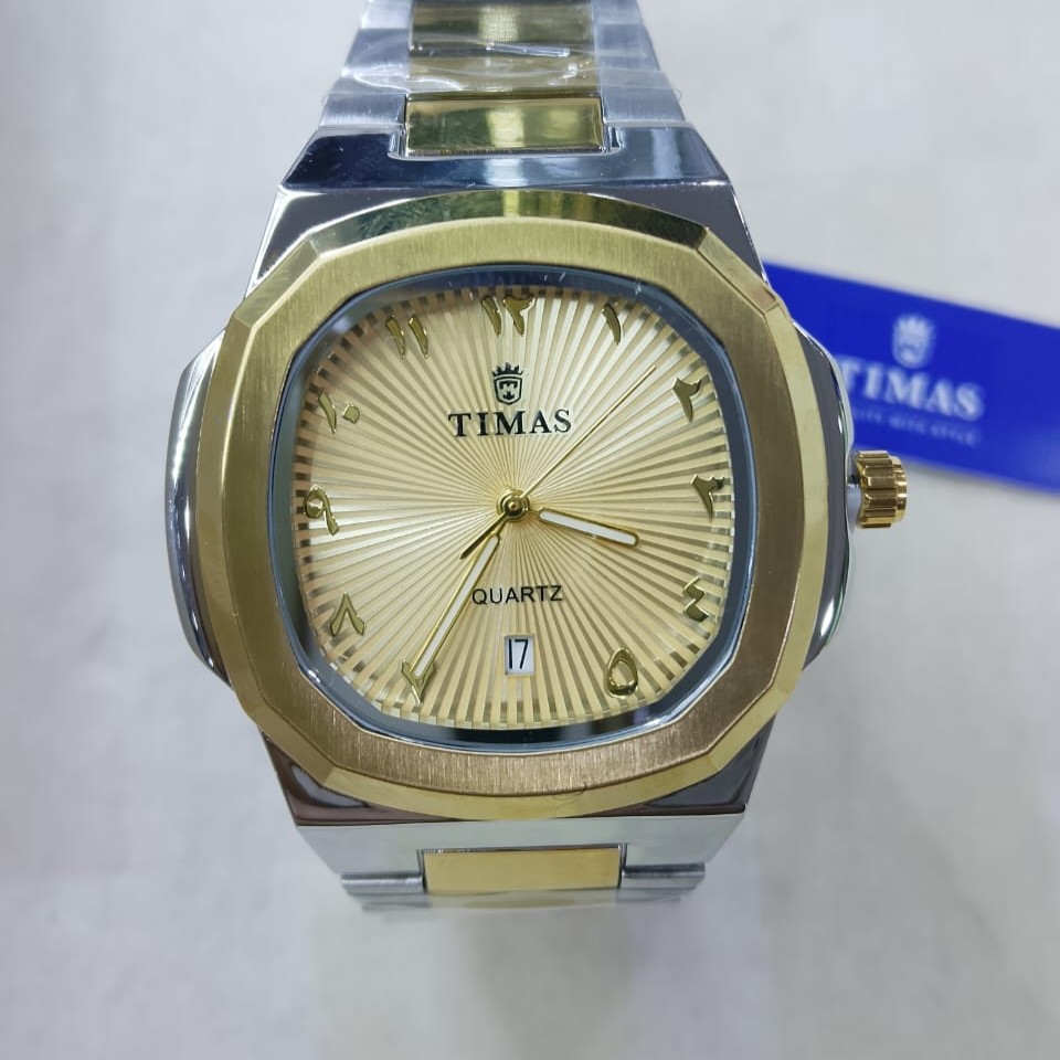 The TIMAS Prestige Two-Tone is a celebration of intricate craftsmanship and bold geometry. Its signature octagonal bezel, finished in a brushed gold tone, is perfectly balanced by a polished silver-tone stainless steel body. The dial is the centerpiece of this model, boasting a deep gold sunray texture that reflects light beautifully, providing a rich backdrop for the raised gold Arabic numeral hour markers.