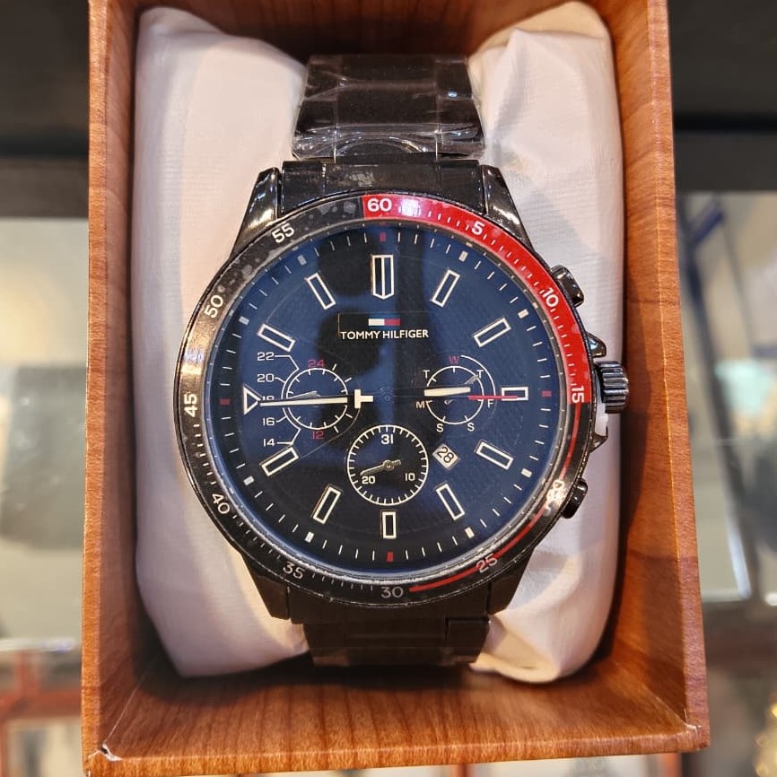 The Tommy Hilfiger Decker is a standout piece in the world of designer sports watches. This timepiece is built for impact, featuring a durable black ion-plated case and a matching link bracelet. The deep navy dial is designed for precision, hosting three functional sub-dials that track day, date, and 24-hour time, accented by the signature Hilfiger flag logo at 12 o’clock.